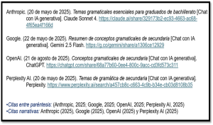 Fuente: Comienza con el nombre de la herramienta de IA, que puede ser general, por ejemplo: ChatGPT, Gemini, o el nombre del modelo ChatGPT-5 o Gemini 2.5 Flash. El último elemento de la fuente es la URL del chat.