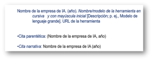 Al utilizar herramientas IA para encontrar información, tal como usamos bases de datos o motores de búsqueda como Google, en ese caso solo citamos las fuentes que encontramos y utilizamos en nuestro trabajo.